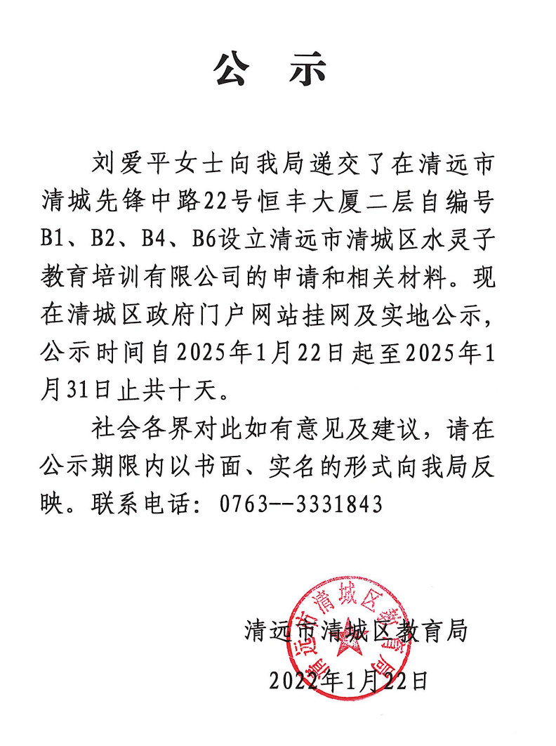 关于刘爱平女士申请设立清远市清城区水灵子教育培训有限公司的公示